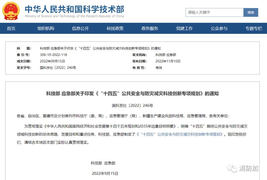 11月10日,科技部、應急部印發《“十四五”公共安全與防災減災科技創新專項規劃》。