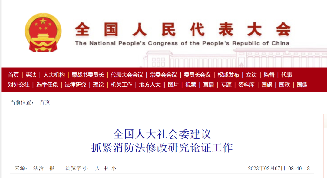 近日,全國人大社會委發布公告,建議有關部門按照黨中央關于深化消防執法改革、消防救援隊伍改革的決策部署,結合落實《“十四五”國家消防工作規劃》,針對新形勢下消防工作遇到的新情況、新問題以及近年來重特大火災暴露的突出問題,抓緊對消防法修改的研究論證工作,條件成熟時,建議納入立法規劃或立法計劃。