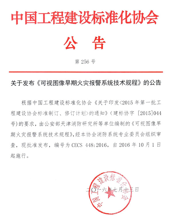 天消所所制定的CECS《可視圖像早期火災(zāi)報(bào)警系統(tǒng)技術(shù)規(guī)程》標(biāo)準(zhǔn)已發(fā)布