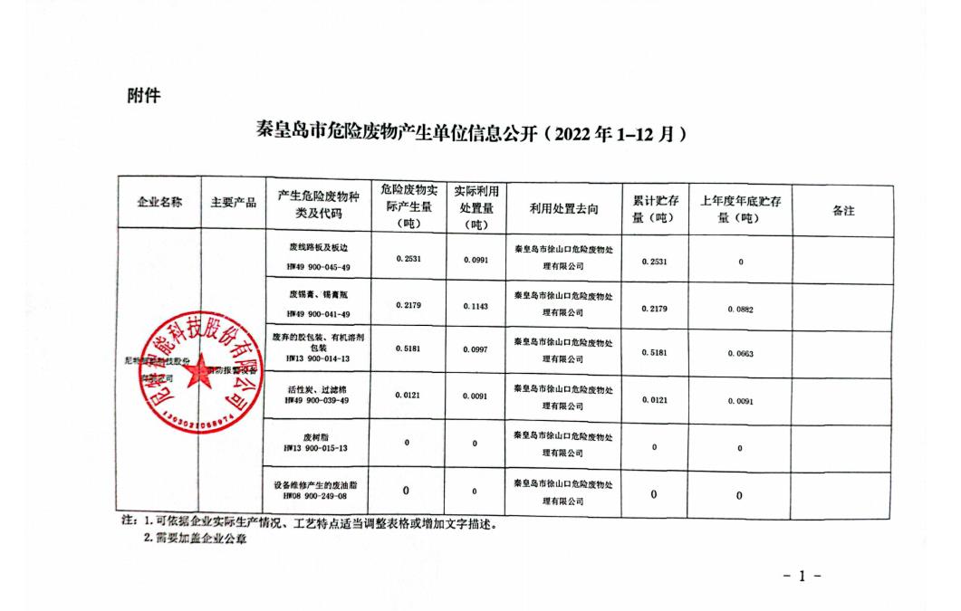尼特公司2022年危險廢物產生單位信息公開