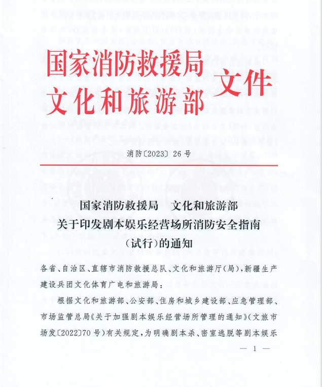 近日,國家消防救援局、文化和旅游部聯(lián)合印發(fā)《劇本娛樂經(jīng)營場所消防安全指南(試行)》,明確了劇本殺、密室逃脫等劇本娛樂經(jīng)營場所的消防安全基本條件、消防安全管理、用火用電安全管理、易燃易爆可燃物安全管理以及安全疏散管理。