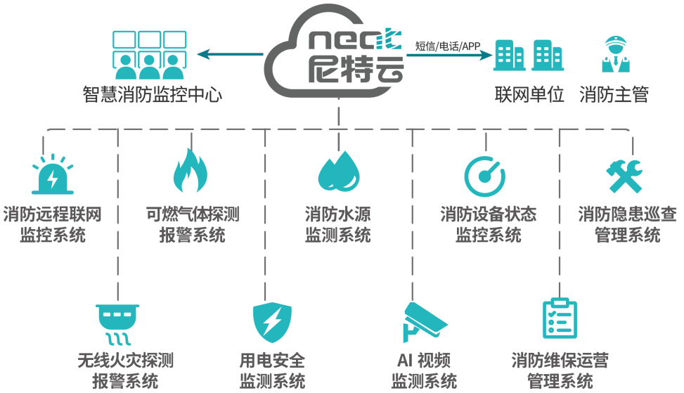在《意見》中明確指出,鄉鎮(街道)和村(社區)應在相關部門指導下建立風險隱患“一張圖”,暢通預警信息發布和傳播渠道。消防安全風險隱患是生產生活中必須要注意的方面,也是提升基層應急管理能力的重要一環。作為國內較早從事物聯網消防系統研究的企業,尼特智能歷經多年的市場探索和經驗總結,綜合運用大數據、云計算、無線傳感等技術,搭建了一套安全、可靠的智慧消防解決方案,將“人防、物防、技防 ”三結合應用于消防管理和監督中,實現消防管理工作智能化、可視化、痕跡化,切實滿足《意見》中關于進一步推動推動公共安全治理模式向事前預防轉型的工作內容。