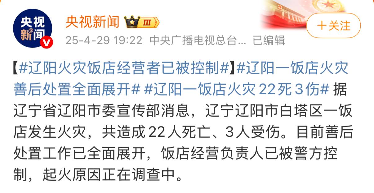 4月29日12時(shí)25分,遼寧遼陽(yáng)市白塔區(qū)一家飯店突發(fā)火災(zāi)。事故共造成22人死亡、3人受傷,3名傷者經(jīng)全力搶救,均無(wú)生命危險(xiǎn)。